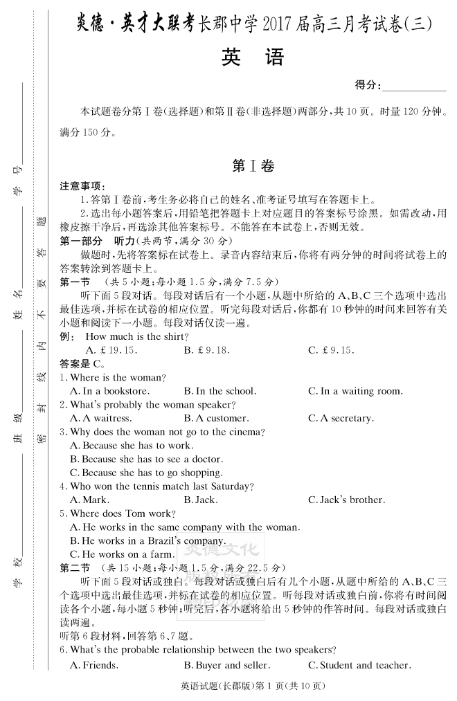 【英語】炎德英才大聯(lián)考2017長郡中學高三3次月考