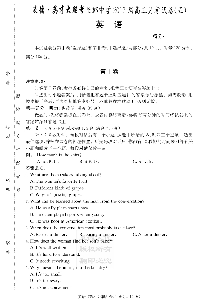 【英語(yǔ)】炎德英才大聯(lián)考2017長(zhǎng)郡中學(xué)高三5次月考