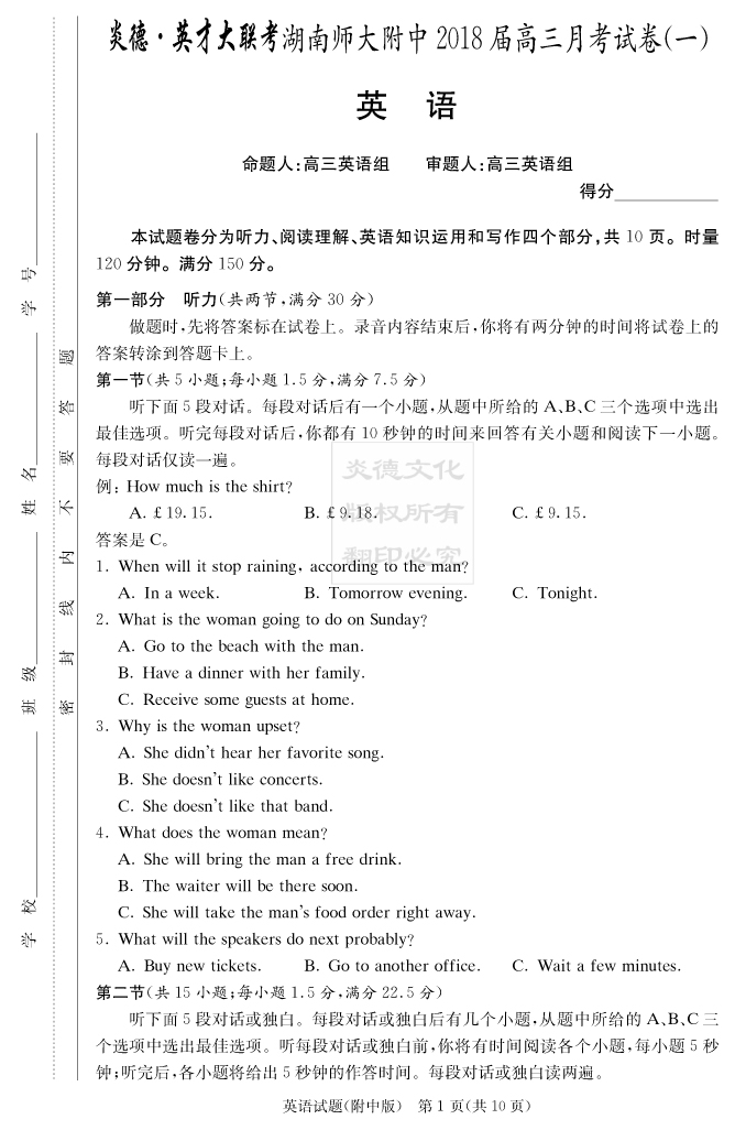 【英語】炎德英才大聯(lián)考2018師大附中高三1次月考