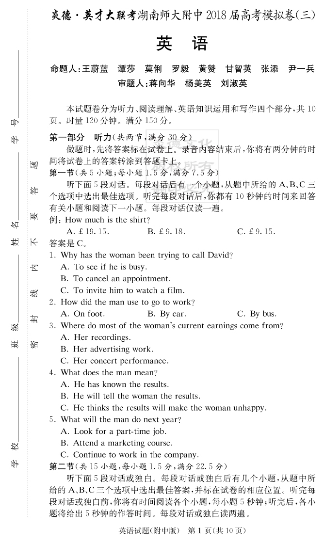 【英語】炎德英才大聯(lián)考2018師大附中高三10次月考(模擬三)