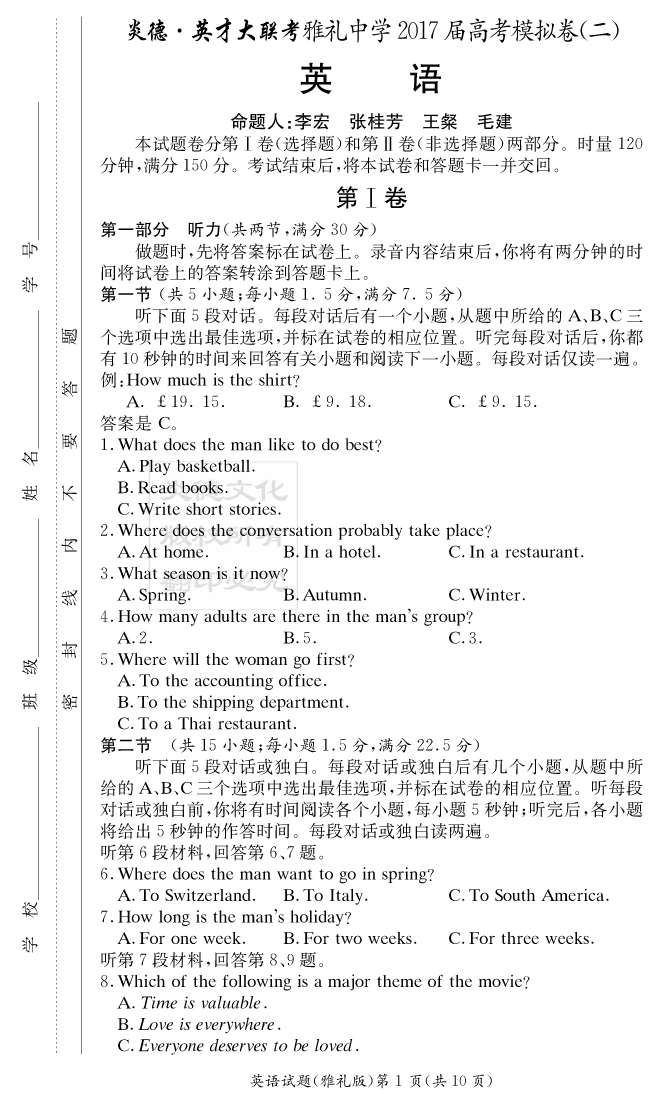 【英語】炎德英才大聯(lián)考2017雅禮中學(xué)高三9次月考(模擬二)