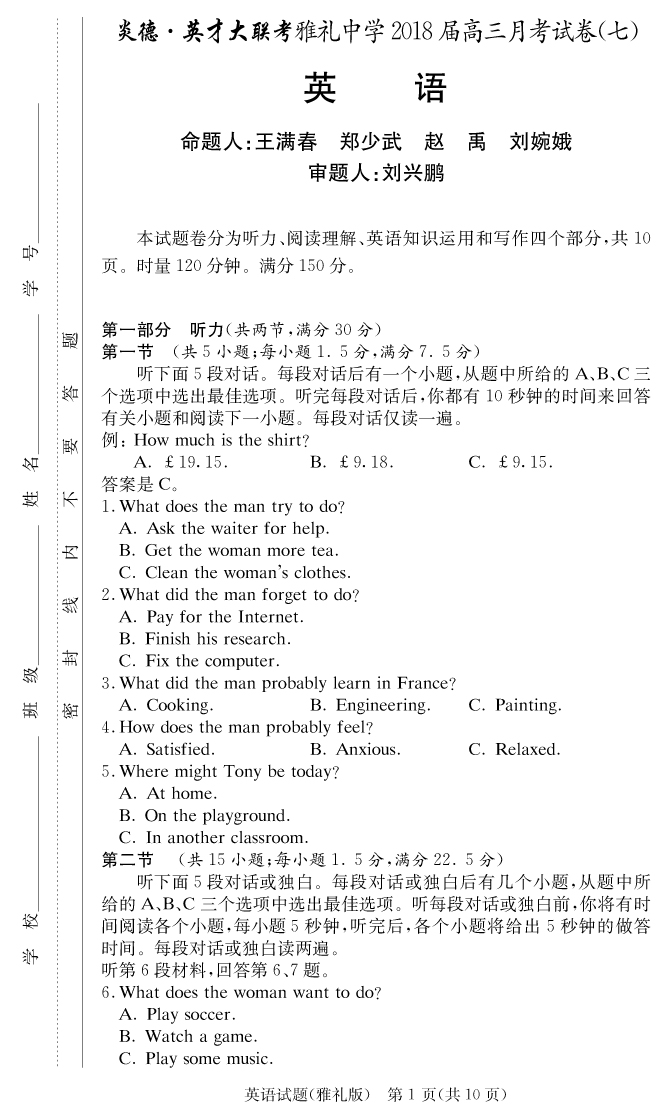 【英語(yǔ)】炎德英才大聯(lián)考2018雅禮中學(xué)高三7次月考