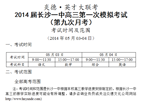 炎德英才大聯(lián)考長(zhǎng)沙一中2014屆高三第一次模擬(第9次月考)考試時(shí)間和范圍(2014.05.0