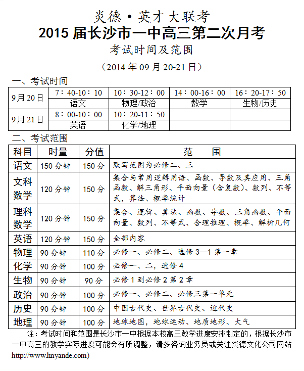 炎德英才大聯(lián)考長沙市一中2015屆高三第2次月考考試時(shí)間和范圍(2014.09.20-21)