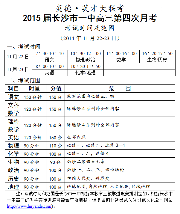 炎德英才大聯(lián)考長沙市一中2015屆高三第4次月考考試時(shí)間和范圍(2014.11.22-23)
