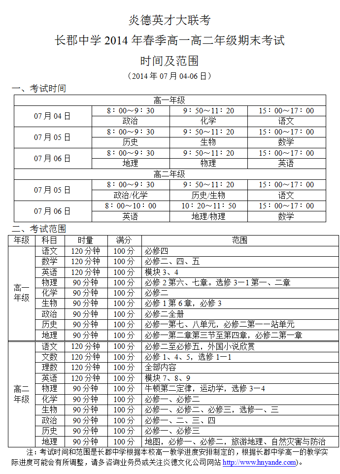 2014年春季長郡中學(xué)高一高二期末考試考試時(shí)間及范圍(2014.07.04-06)