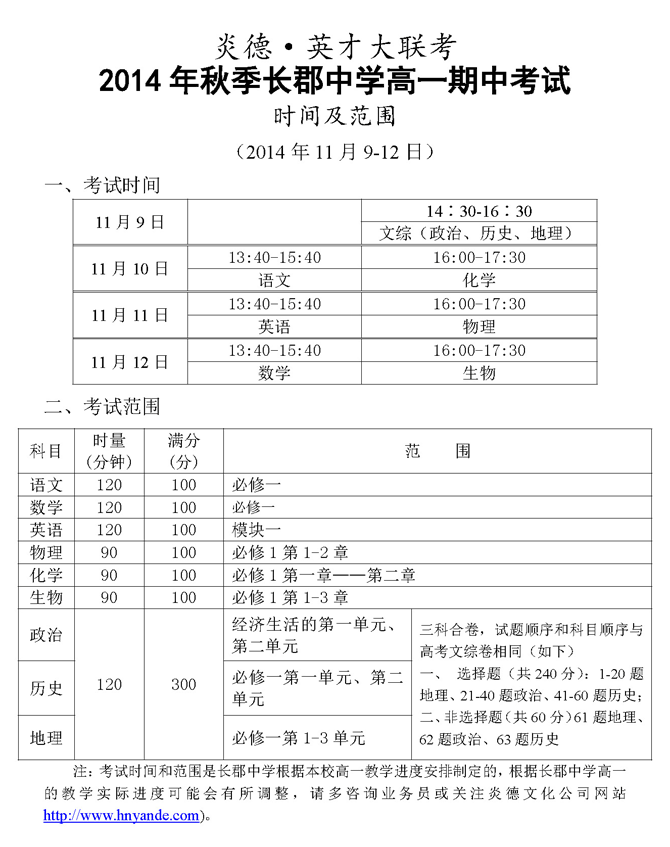 炎德英才大聯(lián)考2014年秋季長(zhǎng)郡中學(xué)高一期中考試時(shí)間和范圍(2014.11.09-12)