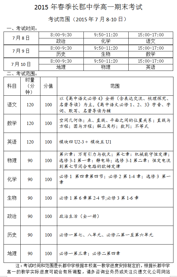 2015年春季長(zhǎng)郡中學(xué)高一期末考試考試范圍(2015年7月8-10日)