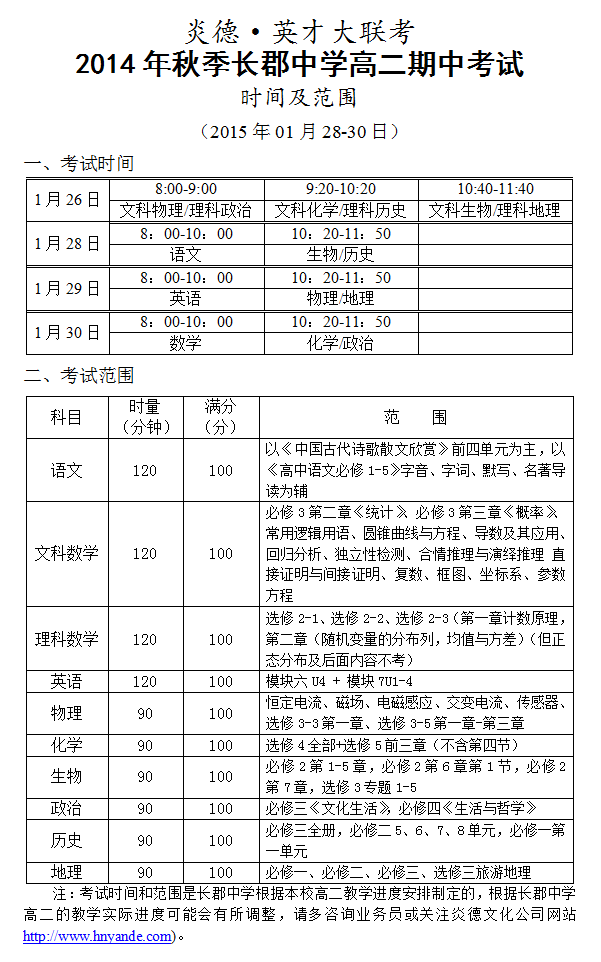 炎德英才大聯(lián)考2014年秋季長郡中學(xué)高二期末考試時間和范圍(2015.01.26、27-30)