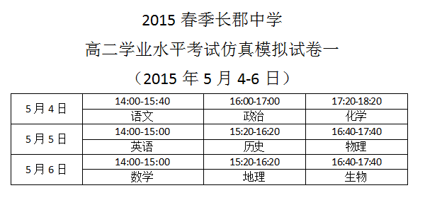 2015春季長郡中學(xué)高二學(xué)業(yè)水平考試仿真模擬試卷一考試時(shí)間安排(2015年5月4-6日)