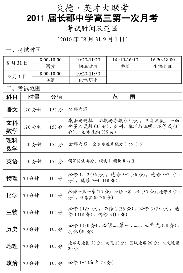 [含聽力答題卡]炎德英才大聯(lián)考長(zhǎng)郡中學(xué)2012屆高三第一次月考考試時(shí)間和范圍