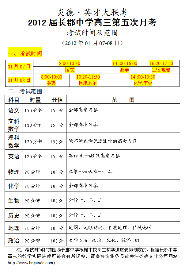 炎德英才大聯(lián)考長(zhǎng)郡中學(xué)2012屆高三第五次月考考試時(shí)間和范圍