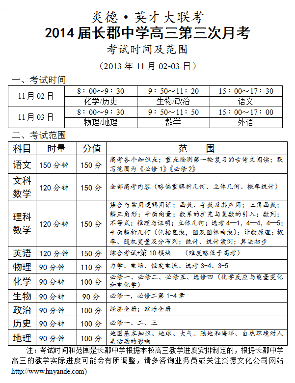 炎德英才大聯(lián)考長郡中學(xué)2014屆高三第3次月考考試時間和范圍(2013.11.02-03)