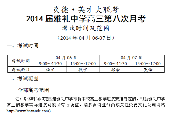 炎德英才大聯(lián)考雅禮中學(xué)2014屆高三第8次月考考試時間和范圍(2014.04.06-07)