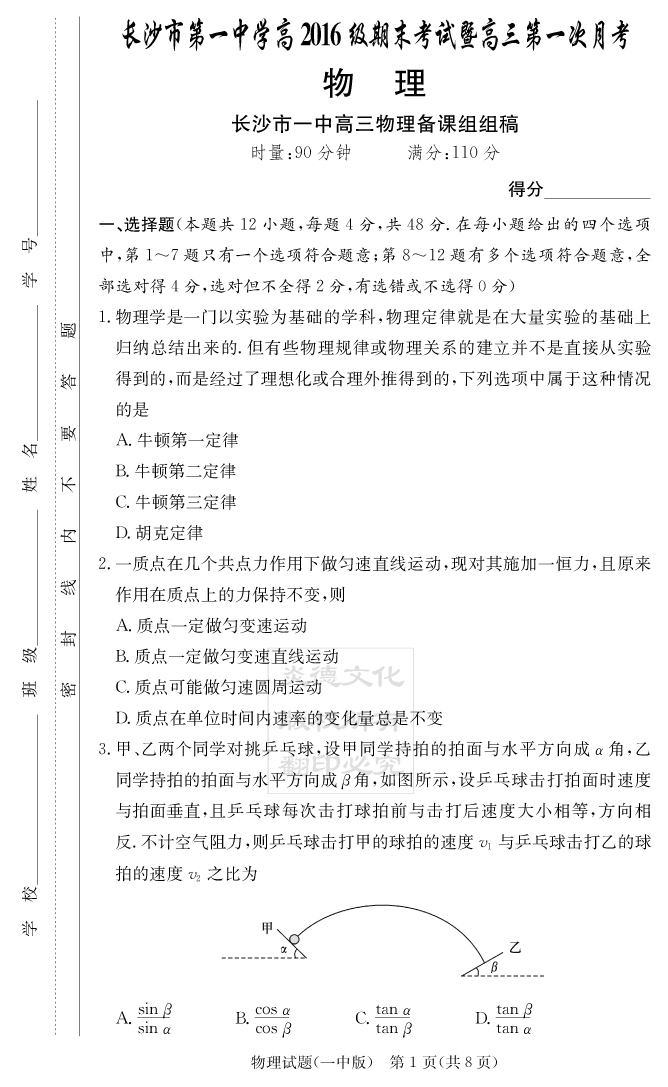 【物理】炎德英才大聯(lián)考2019長(zhǎng)沙一中高三1次月考