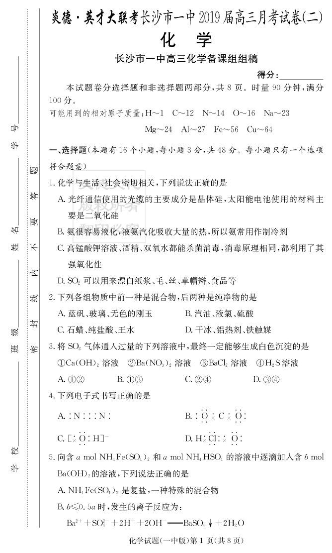 【化學(xué)】炎德英才大聯(lián)考2019長沙一中高三2次月考