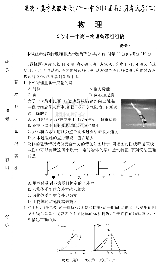 【物理】炎德英才大聯(lián)考2019長(zhǎng)沙一中高三2次月考