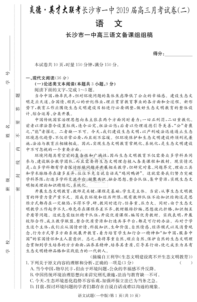 【語(yǔ)文】炎德英才大聯(lián)考2019長(zhǎng)沙一中高三2次月考