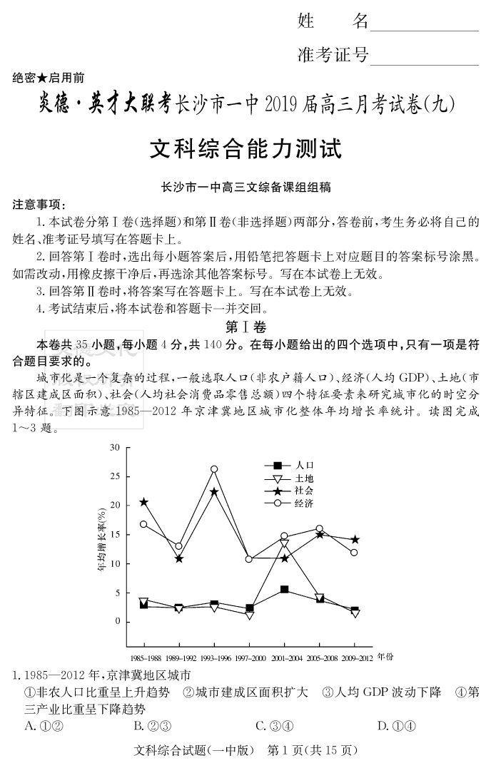 【文綜】炎德英才大聯(lián)考2019長(zhǎng)沙一中高三9次月考