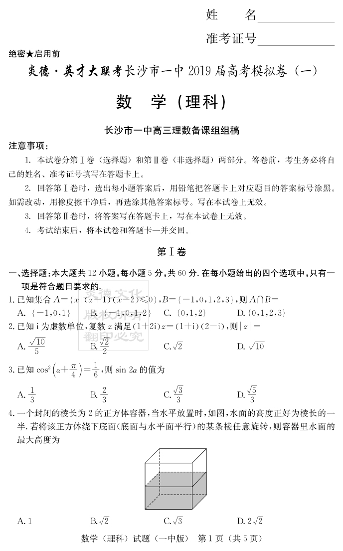 【理數(shù)】炎德英才大聯(lián)考2019長沙一中高三10次月考(模擬一)