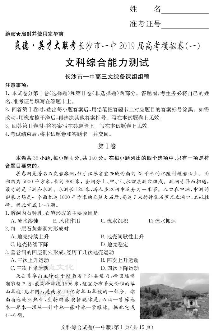 【文綜】炎德英才大聯(lián)考2019長沙一中高三10次月考(模擬一)