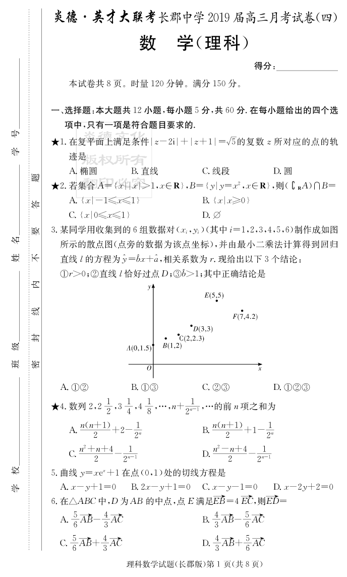 【理數(shù)】炎德英才大聯(lián)考2019長郡中學(xué)高三4次月考