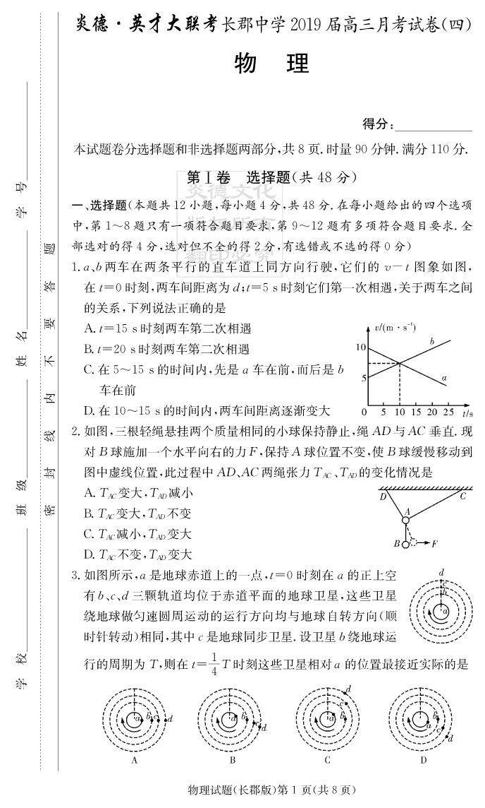 【物理】炎德英才大聯(lián)考2019長郡中學(xué)高三4次月考