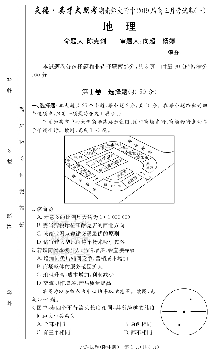 【地理】炎德英才大聯(lián)考2019師大附中高三1次月考