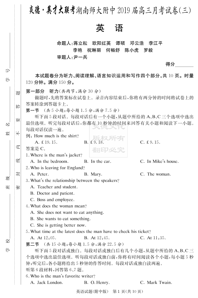 【英語】炎德英才大聯(lián)考2019師大附中高三3次月考