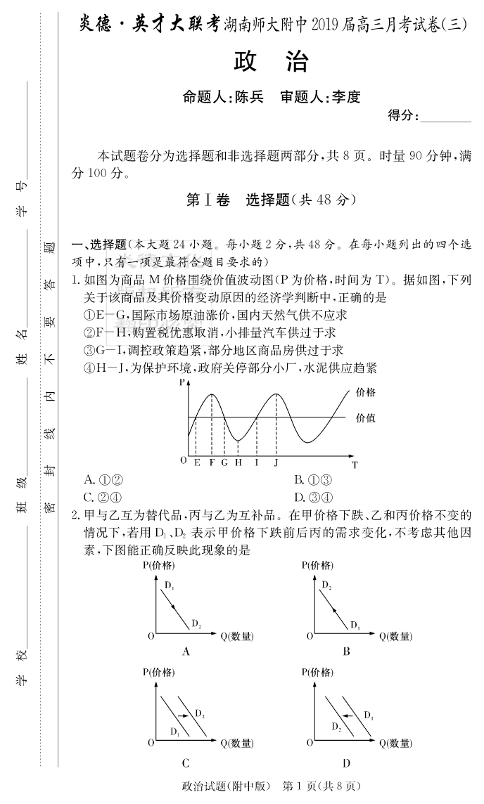 【政治】炎德英才大聯(lián)考2019師大附中高三3次月考