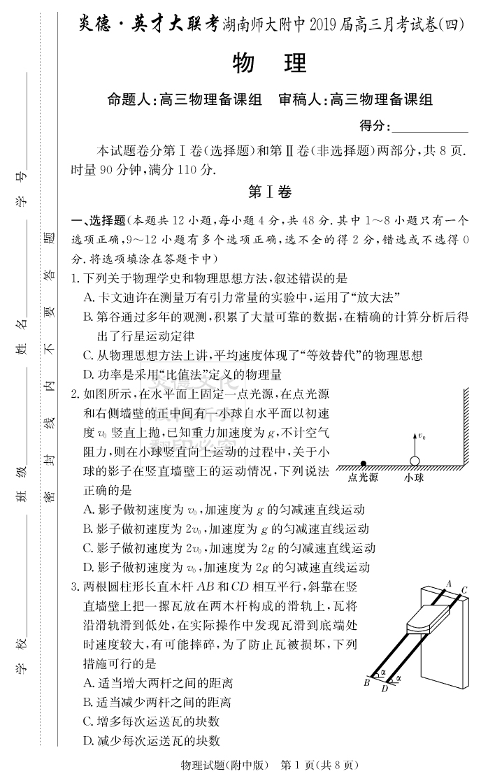 【物理】炎德英才大聯考2019師大附中高三4次月考