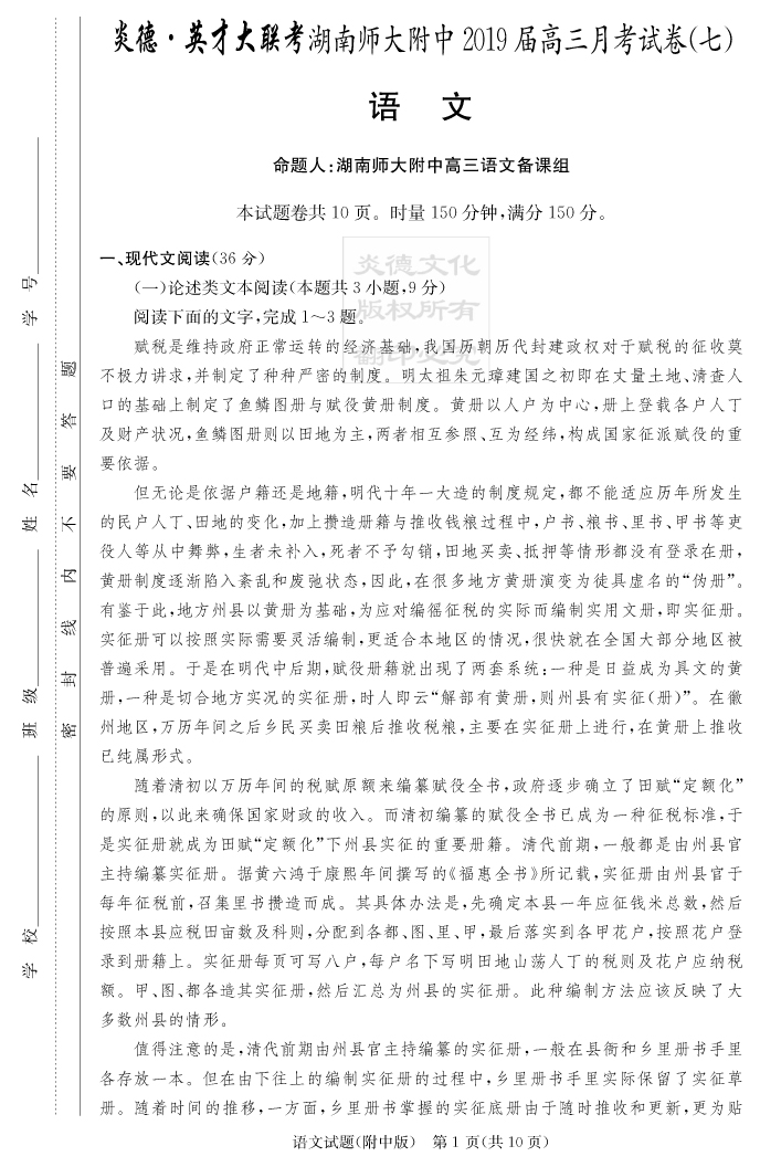 【語文】炎德英才大聯(lián)考2019師大附中高三7次月考