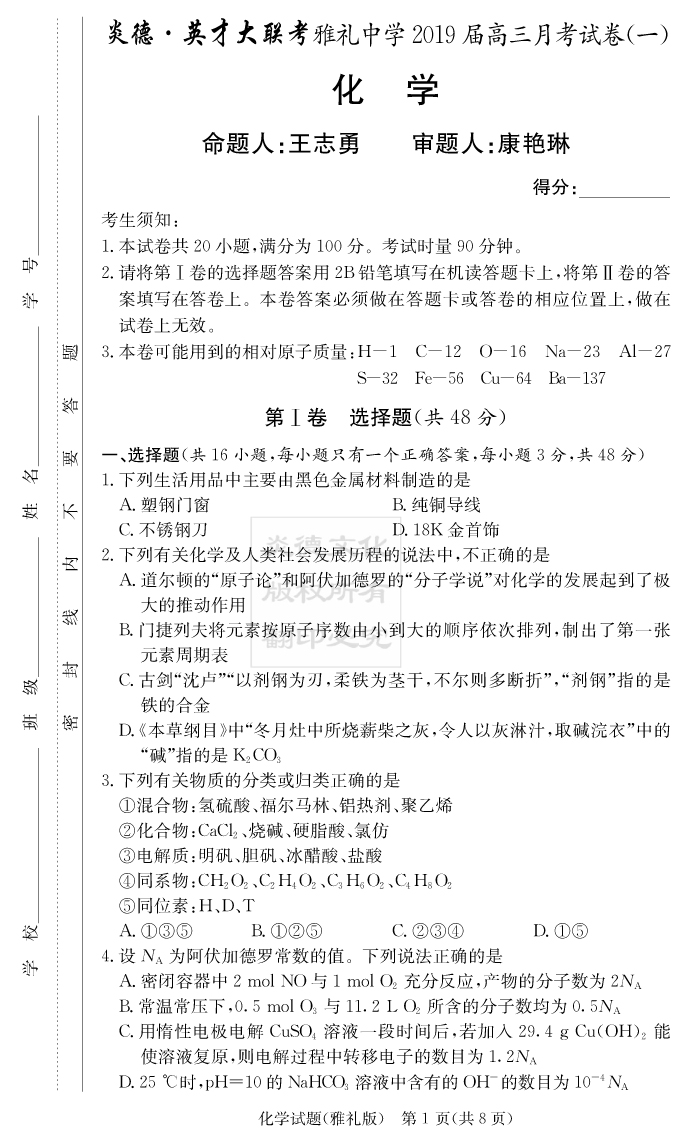 【化學】炎德英才大聯(lián)考2019雅禮中學高三1次月考