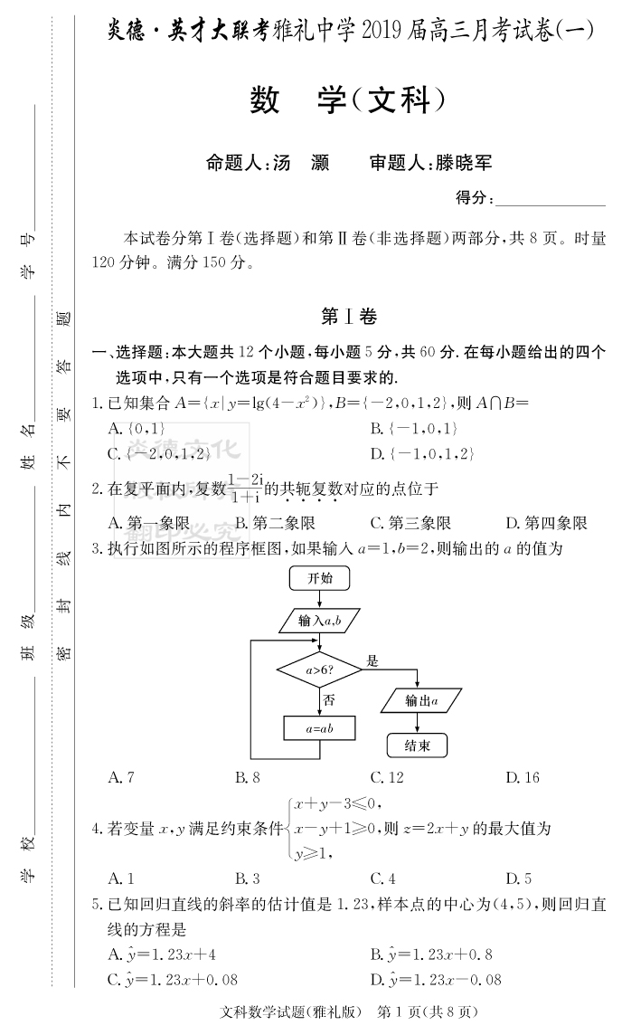 【文數(shù)】炎德英才大聯(lián)考2019雅禮中學(xué)高三1次月考
