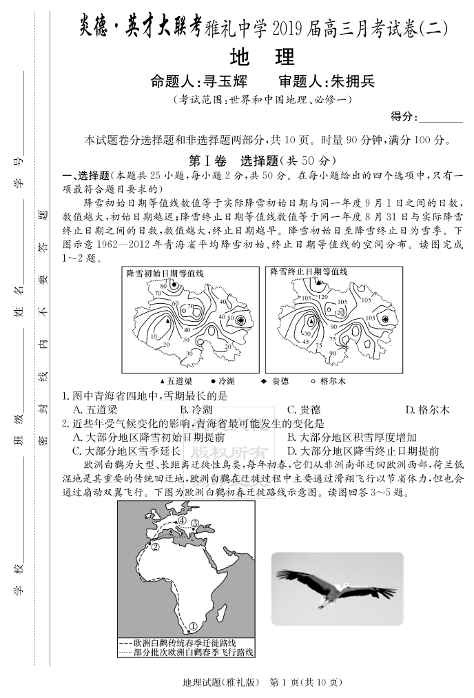 【地理】炎德英才大聯(lián)考2019雅禮中學(xué)高三2次月考