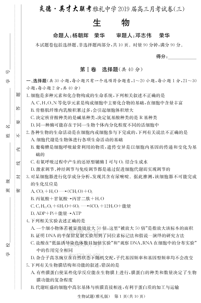 【生物】炎德英才大聯(lián)考2019雅禮中學(xué)高三3次月考