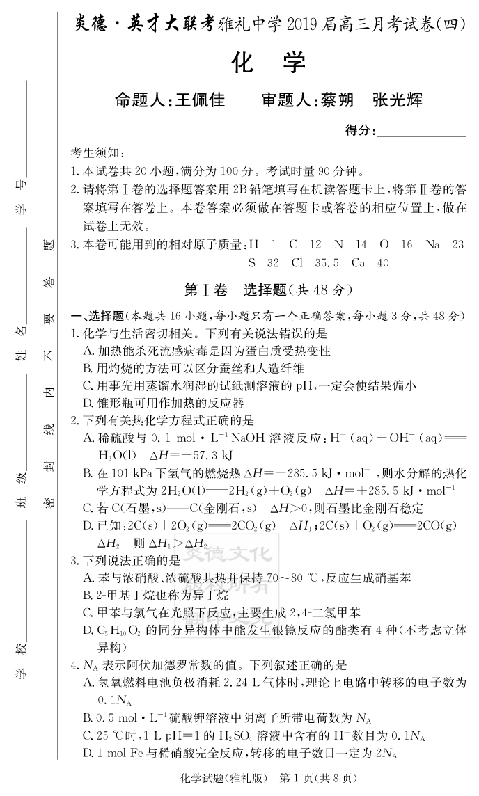 【化學】炎德英才大聯(lián)考2019雅禮中學高三4次月考