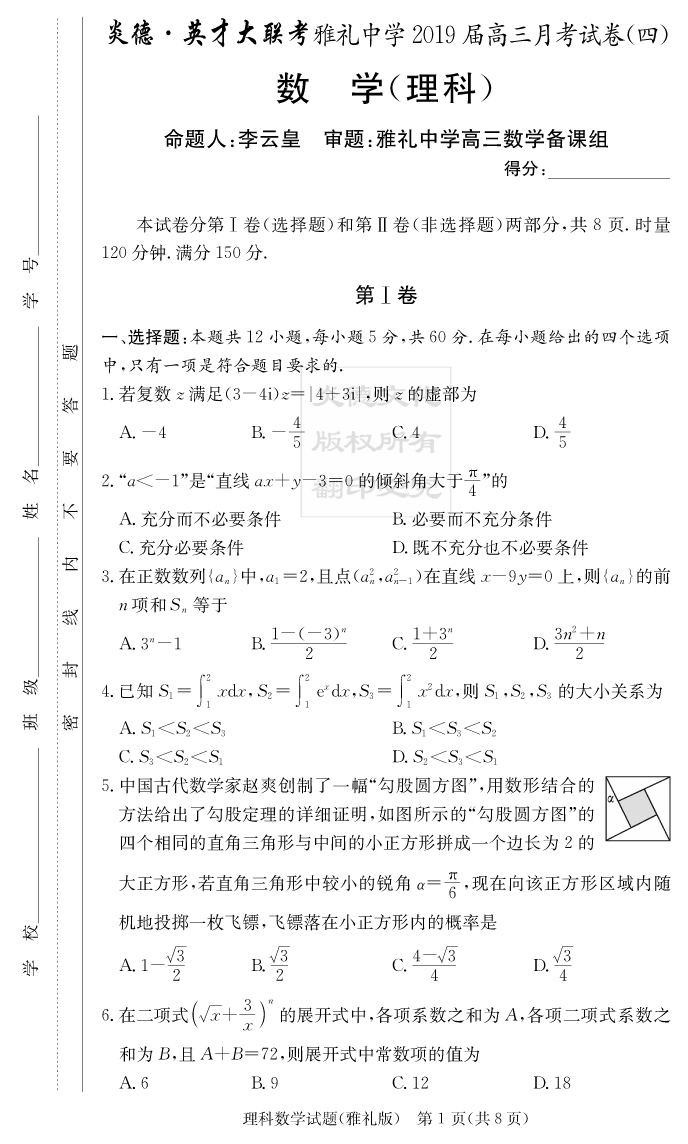 【理數(shù)】炎德英才大聯(lián)考2019雅禮中學(xué)高三4次月考
