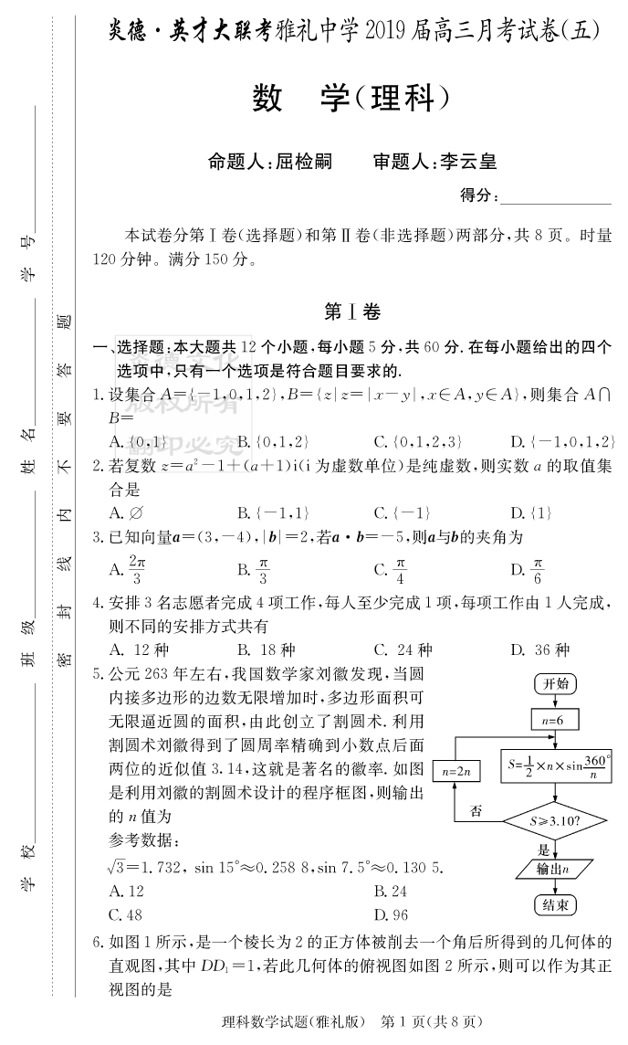 【理數(shù)】炎德英才大聯(lián)考2019雅禮中學(xué)高三5次月考