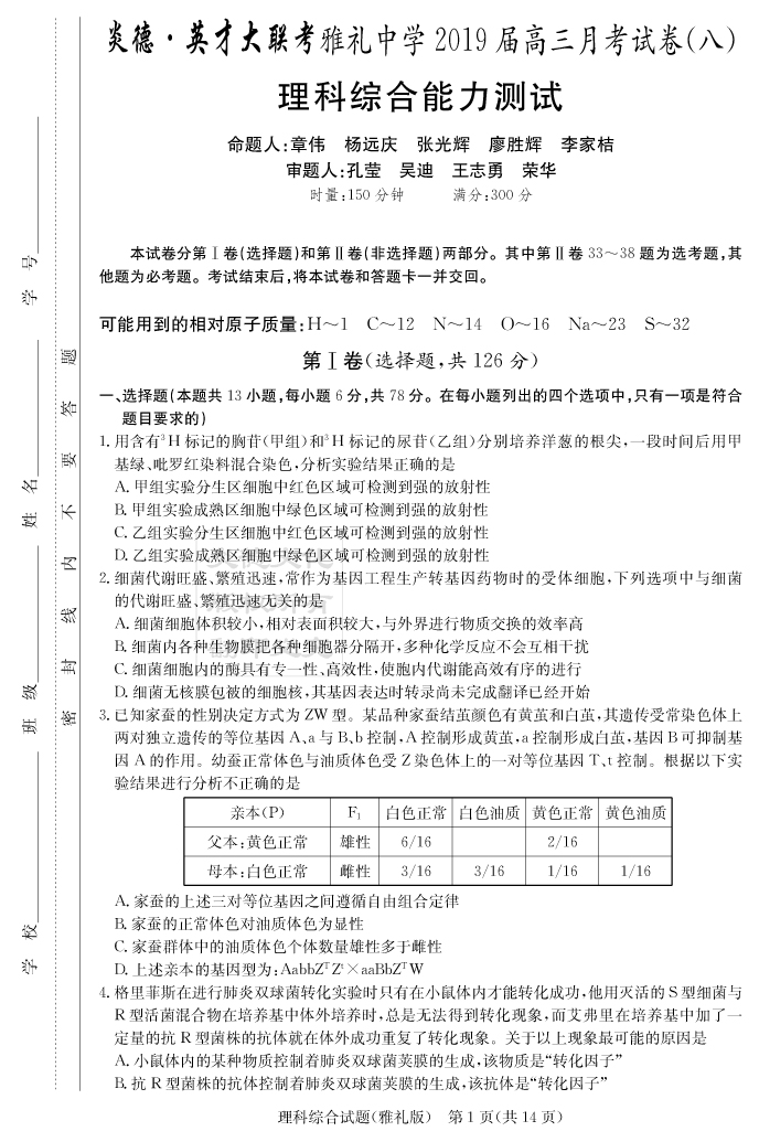 【理綜】炎德英才大聯(lián)考2019雅禮中學高三8次月考
