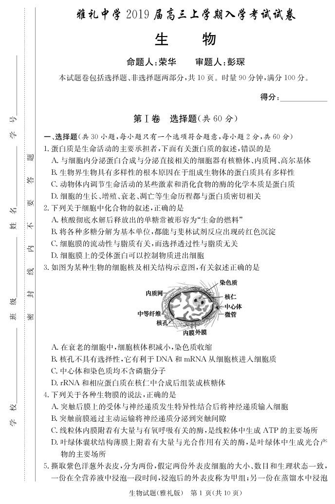 【生物】雅禮中學(xué)2019屆高三上學(xué)期入學(xué)考試
