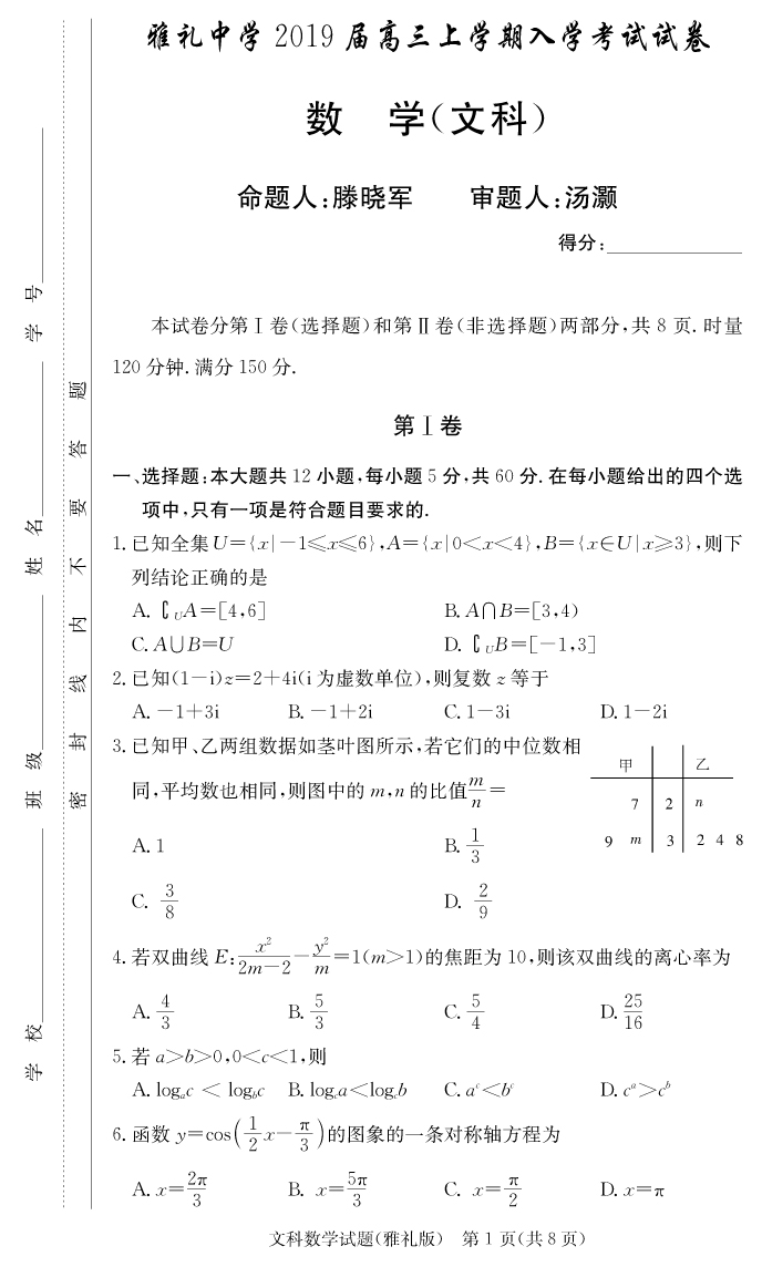 【文數(shù)】雅禮中學(xué)2019屆高三上學(xué)期入學(xué)考試