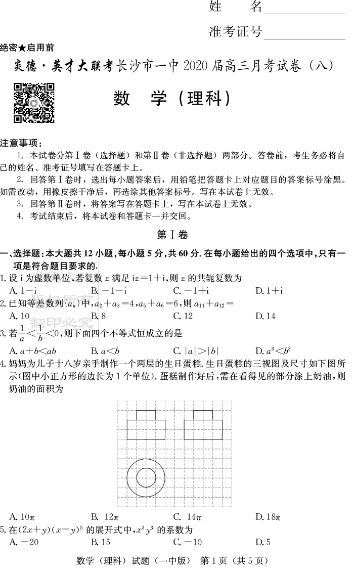 【理數(shù)】炎德英才大聯(lián)考2020屆長沙市一中高三8次月考