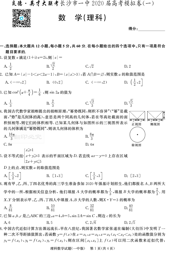【理數(shù)】炎德英才大聯(lián)考2020屆長(zhǎng)沙市一中高三9次月考(模擬一)