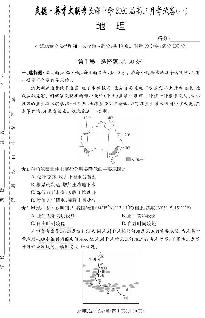 【地理】炎德英才大聯(lián)考2020屆長(zhǎng)郡中學(xué)高三1次月考