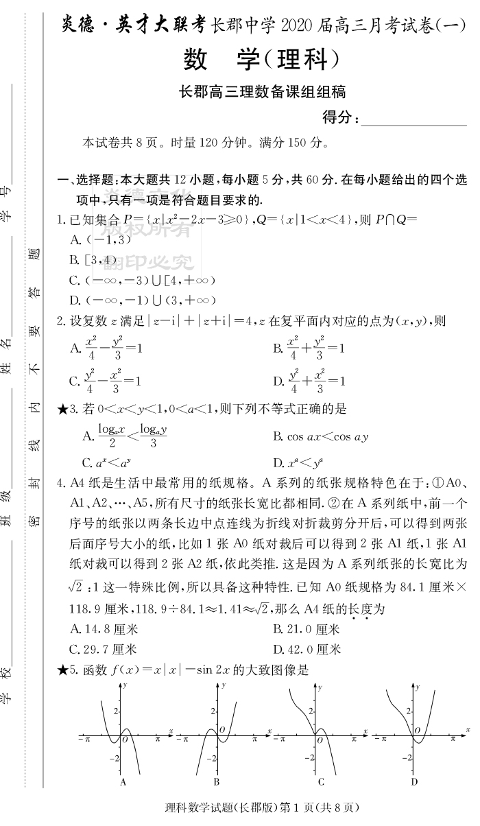 【理數(shù)】炎德英才大聯(lián)考2020屆長(zhǎng)郡中學(xué)高三1次月考
