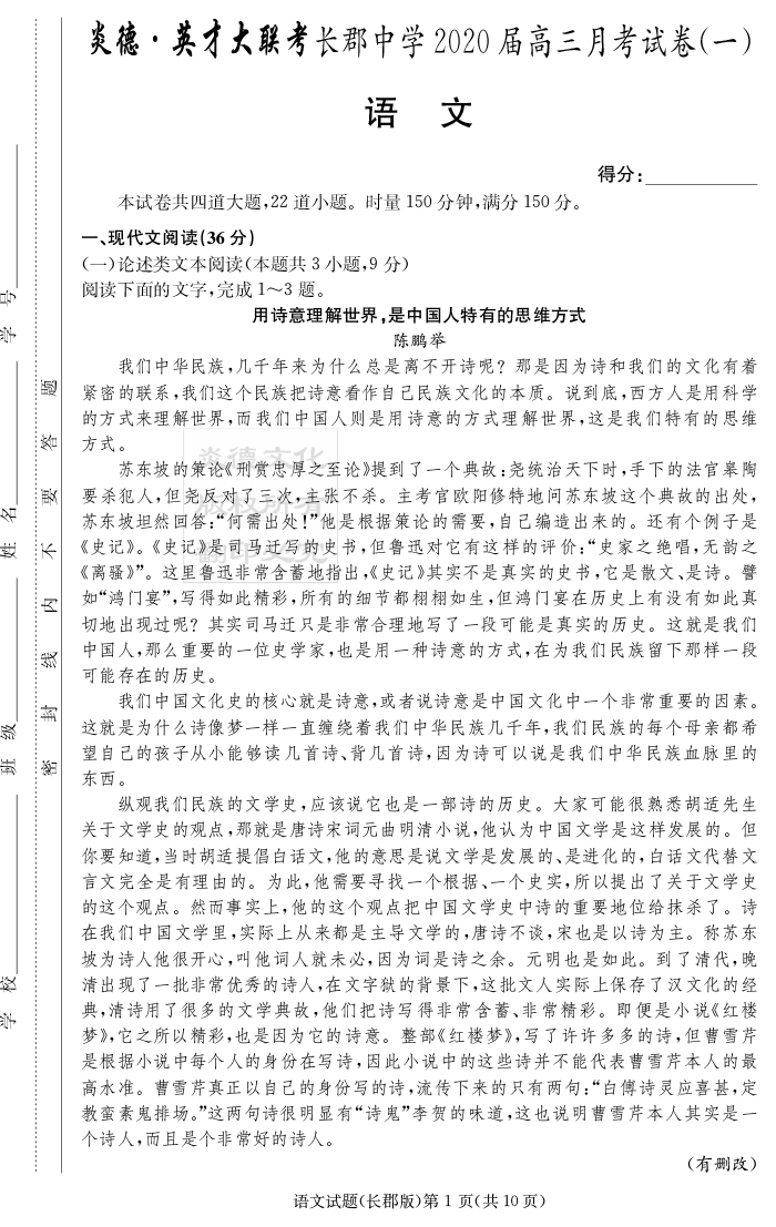 【語文】炎德英才大聯(lián)考2020屆長郡中學(xué)高三1次月考