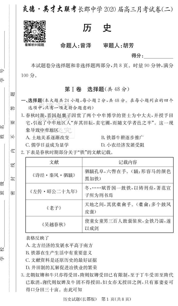 【歷史】炎德英才大聯(lián)考2020屆長郡中學(xué)高三2次月考