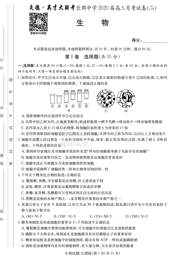 【生物】炎德英才大聯(lián)考2020屆長郡中學(xué)高三2次月考