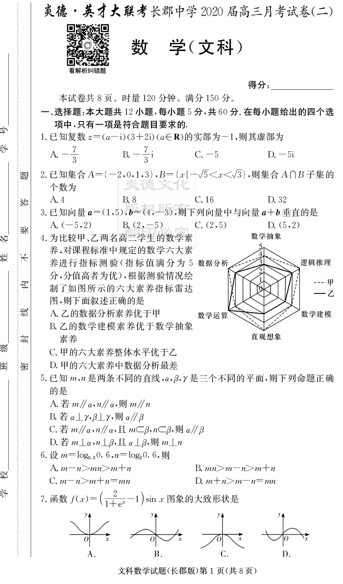 【文數(shù)】炎德英才大聯(lián)考2020屆長郡中學(xué)高三2次月考
